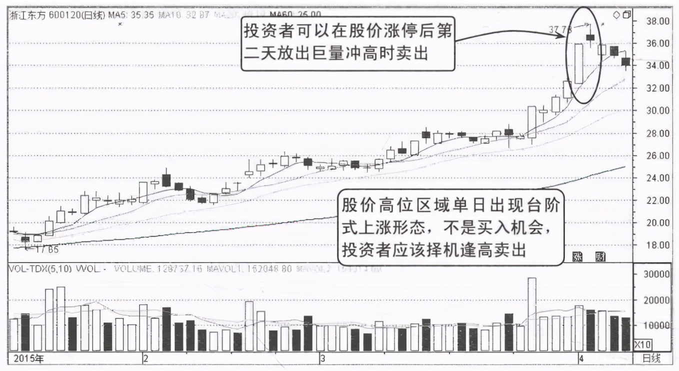 第二天股价高开后冲高回落,成交量也迅速放大,收出一根带有长上影线的小阴线,上影线长度大于阴线实体几倍,表明股价上档抛压非常严重,结合4月1日股价收涨停后成交量的表现形态,可以推断出当时的成交量放量是主力在大力抛售筹码。投资者见到台阶式上涨形态必须冷静地判断,以防主力诱多陷阱。