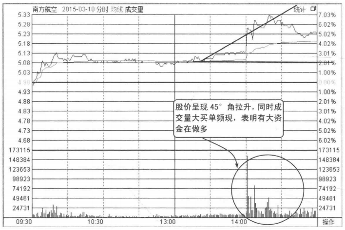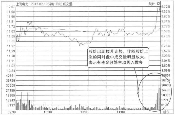 图4-1所示为上海电力的分时走势图,从图中可以看到股价低开后,在开盘至10:30左右的时间段里走势并不活跃。在13:00以后,成交量时有放大,股价出现拉升走势。每次拉升的手法相似,都是先小幅拉升,又很快进入震荡,然后再次拉升。在拉升过程中成交量明显放大,股价震荡向上运行,股价重心逐步上移。