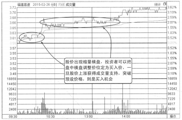 图4-6所示为福建高速的走势,从图中可以看到该股经过档盘整理走势后,成交量放大,股价试图突破整理平台。