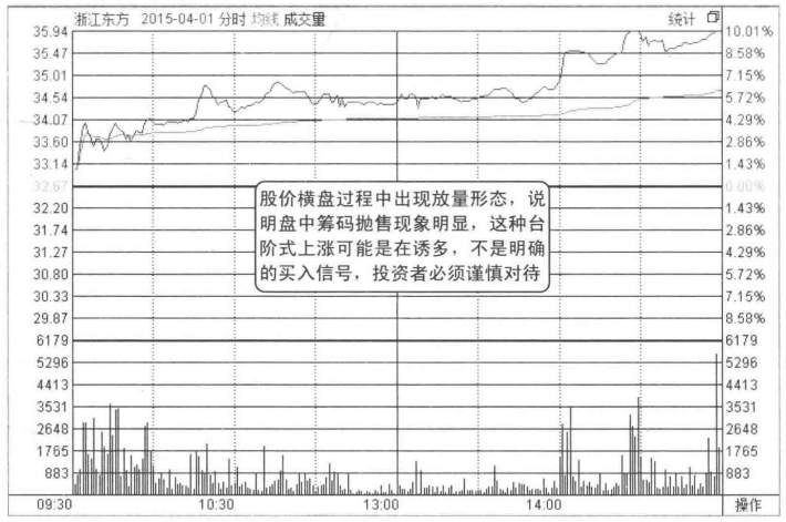 图4-8所示为浙江东方在的走势,该股经过前期大幅上涨后,4月1日当天股价分时走势出现了台阶式上涨的形态。然而股价当天快速拉升后的震荡整理过程中,盘中筹码抛售明显,主力在诱多的可能性很大。