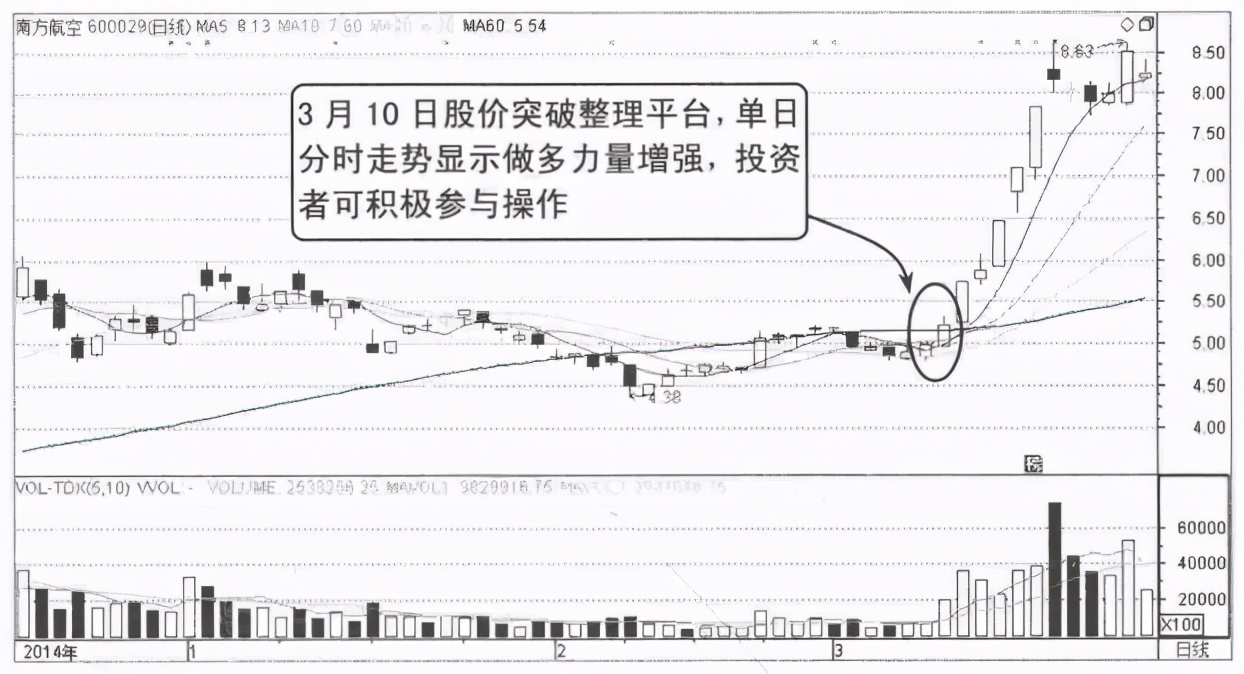 图4-4所示为南方航空在的走势,股价经过一波拉升后出现横盘调整走势,然而同时股价5日、10日、20日均线呈多头排列,60日均线逐渐走平,表明股价趋势仍然向多。