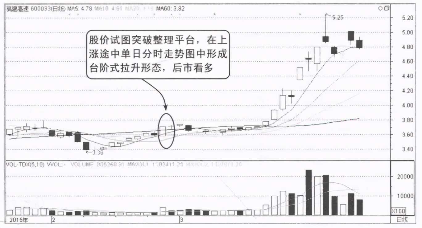 图4-5所示为福建高速的分时走势图,从图中可以看到股价在当天走势中走出了台阶式上涨。