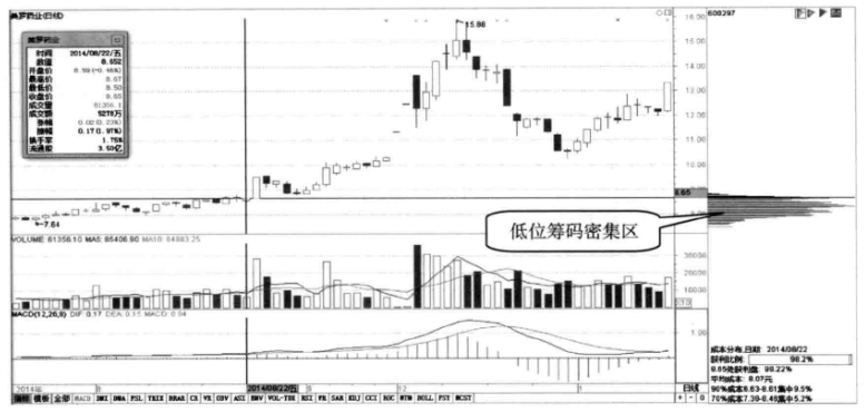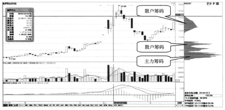 如图5-9所示,2014年8月,美罗药业(600297)结束横盘整理后开始上涨。在横盘整理过程中,筹码在低位高度密集。在这些密集的筹码中,有一部分是主力筹码,有一部分是散户筹码。通过随后上涨行情中筹码的变化,投资者可以将两者的筹码区分开来。