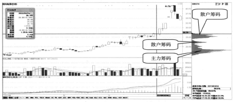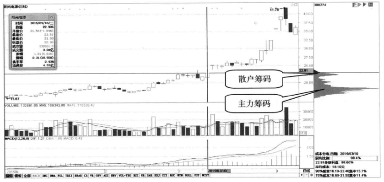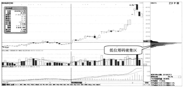 如图5-11所示,2015年2月13日,阳光电源(300274)结束横盘整理后开始上涨。在之前的横盘整理过程中,该股的筹码在低位高度密集,这些密集的筹码中,有一部分是主力筹码,也有一部分是散户筹码。通过随后上涨行情中筹码的变化,投资者可以将两者的筹码区分开来。