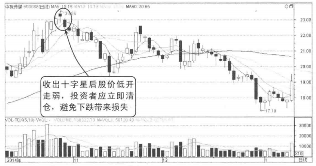 图3-2所示为中视传媒的走势,该股股价在高位出现十字星形态后,第二天股价低开。