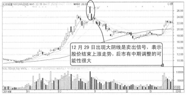 应用实例——北京城建(600266)的高位收大阴线卖点图