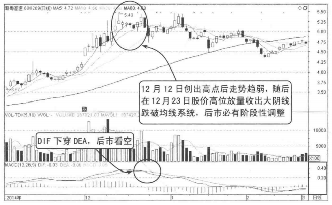图3-6所示为赣粤高速的走势,该股经过拉升于12月12日在高位收出5.48元后股价出现小幅回落,随后的交易日股价走势转弱,5日均线拐头向下,表明股价短期内可能会出现调整。