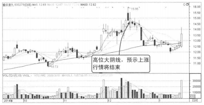 图3-7所示为重庆港九在的走势,该股均线系统呈现多头排列,走势积极向多。在12月22日股价开盘持续走弱,当天收出一根大阴线覆盖前三天的阳线实体,标志股价即将迎来下跌行情。