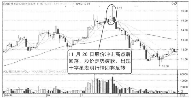 当主力出货接近尾声时,上涨动能减弱,受到上档抛压盘的回吐,股价走势开始回落,为了让投资者对后市仍有幻想,主力拉起股价,同时再次吸引场外资金过场,到收盘收出了一根十字星。
