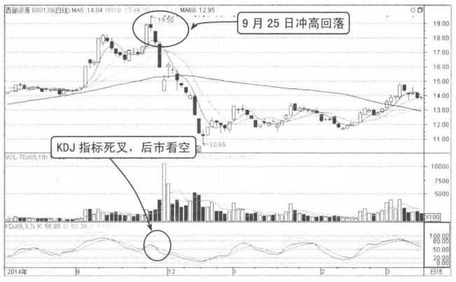 图3-4所示为西部资源的走势,经过大幅拉升股价进入高位区域,当股价冲击19.5元后走势开始疲软,随后的两个交易日股价收出带上下影线的小阴线和大阴线。成交量呈现逐步缩小的形态,KDJ指标的J线有向下运行趋势。