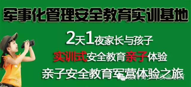 2天1夜的家长与孩子亲子军营安全教育之旅,共同学习安全防护知识,火灾,地震,触电,骨折,增强体质,交通事故逃生,高层电梯事故自救,孩子紧急伤害救助,孩子溺水救护等;