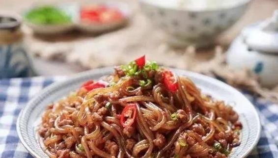 3、煮沸时,加入泡好剪段的红薯粉丝,加盖中火煮5分钟左右,转大火收汁。留适量汤汁,关火装盘,撒上少许小米椒圈和葱花,蚂蚁上树完成!