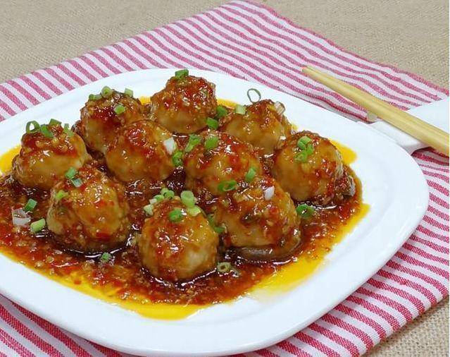 4、热锅倒油,小火倒入姜末炒几下,倒入蒜末炒香,下入泡椒末炒出油红味香,倒入糖醋汁推匀,倒入蒸香菇的水,最后加入水淀粉勾芡,浇在肉丸上,撒上葱花就好了。