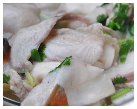 3、将鱼肉,斜刀片成大片,不要片得太薄,0.5CM左右厚度为好将片好的鱼片放入大碗中,加入料酒少许、黑胡椒粉、及少许生粉稍微抓腌一下,淋1小勺油稍加搅匀静置约10分钟备用;