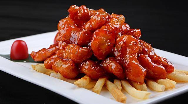 3、热锅放油,将腌制好的鸡肉放油炸至,炸至金黄熟透捞出控油;