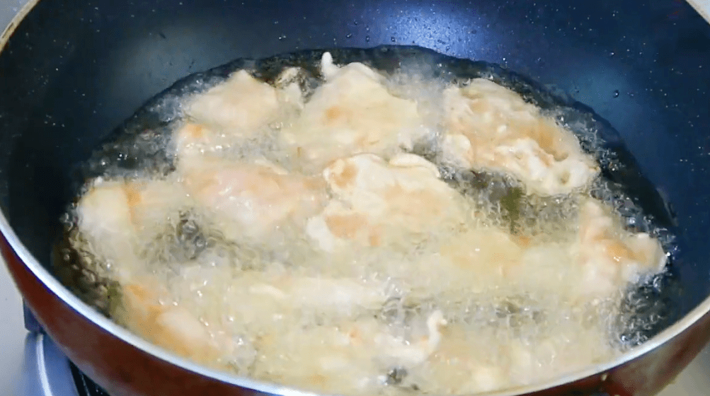 3.起一锅,里面倒入足量的食用油,等到油温5成热的时候,放入筷子能够迅速起小气泡就可以了。我们把肉片一片一片放入锅里,把火调成中火,开始炸肉片。刚开始的时候不要去搅动肉片,等到表面稍微定型后再翻动一下,让肉片受热均匀,这样炸出来才更漂亮。炸至表面金黄我们先捞出来,再把油温升高一些,接着把肉片再倒入锅里,复炸10秒左右,控油出锅备用。