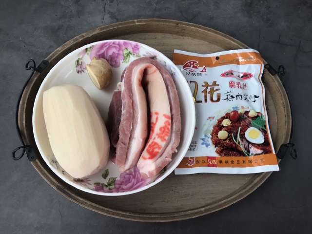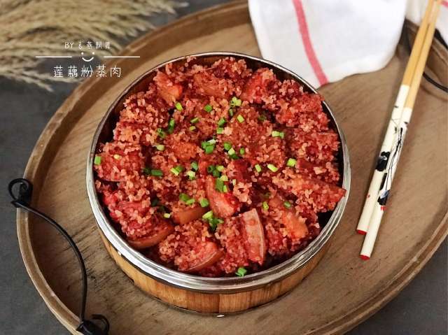 原料:五花肉400克,莲藕270克,腐乳粉蒸肉料包1袋,生姜适量,黄酒适量。