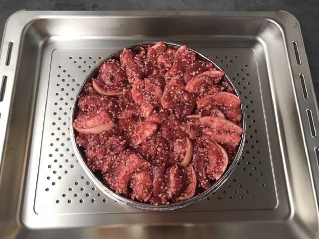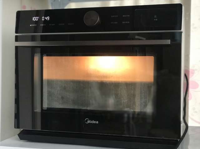 8、美的蒸烤箱选择鲜嫩纯蒸模式,放入竹笼屉100度50分钟,开启后蒸烤箱里会喷出水雾,保证里面的湿度和温度而不会使蒸的东西发干。