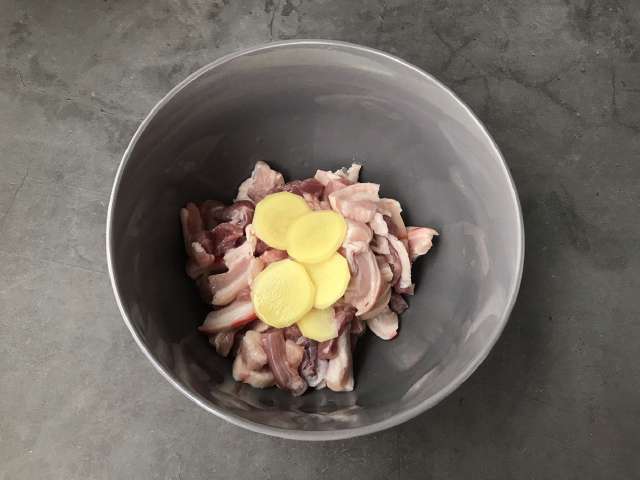 3、五花肉切片放入适量黄酒和姜片抓匀。