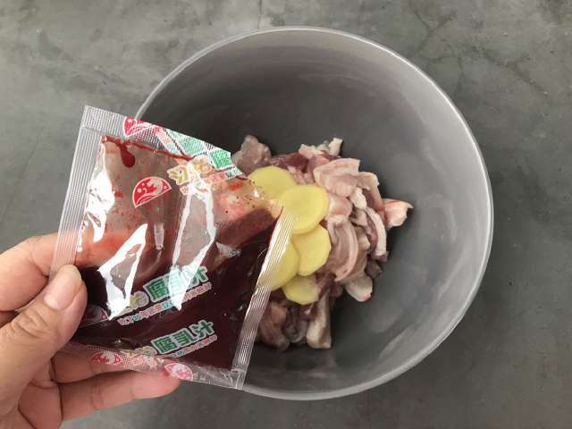 4、先把粉蒸肉料包里的腐乳汁倒入五花肉中拌匀。