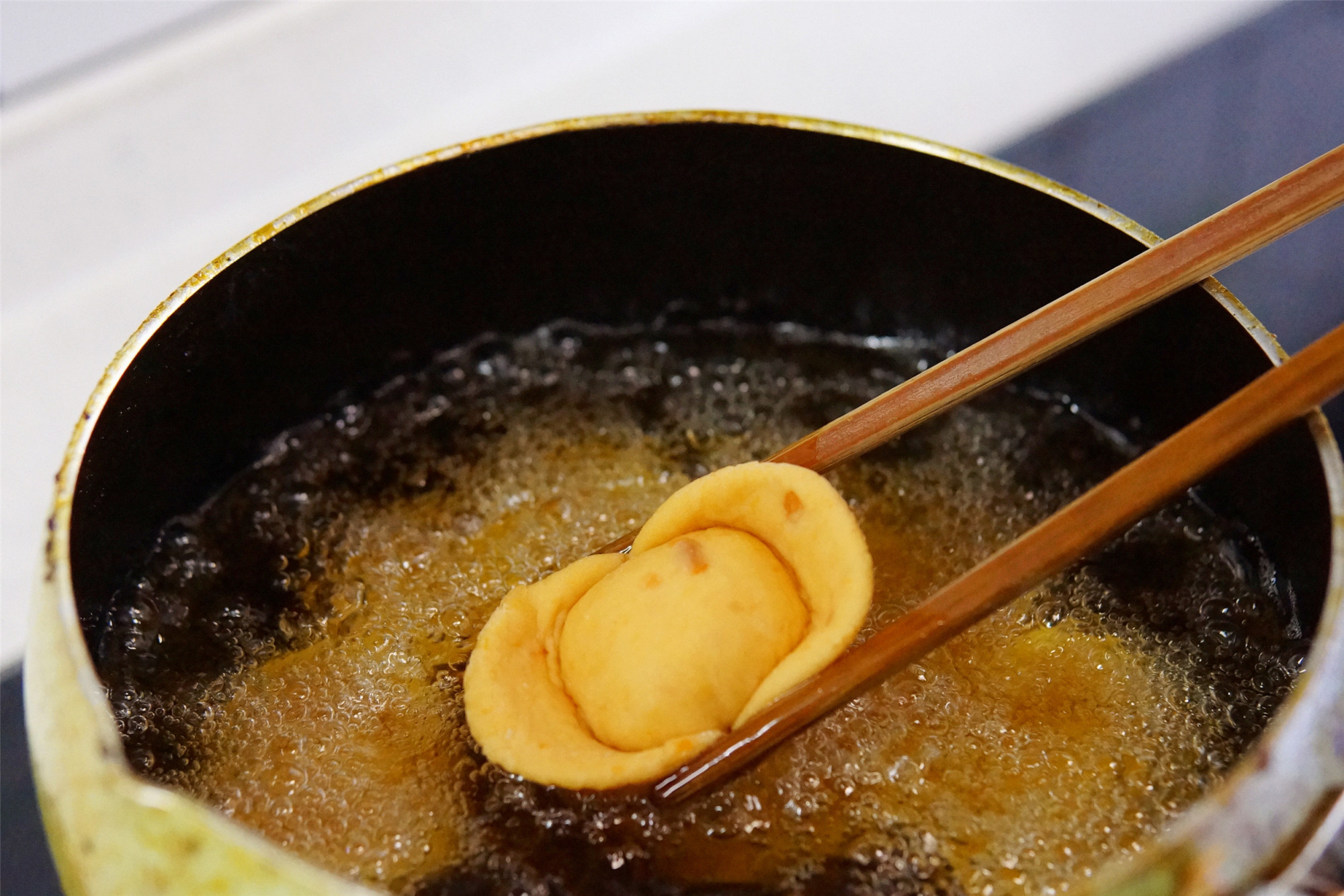 4、锅中加入较多的油,油温升至5成热,小火慢炸至元宝表面金黄,捞出控油。