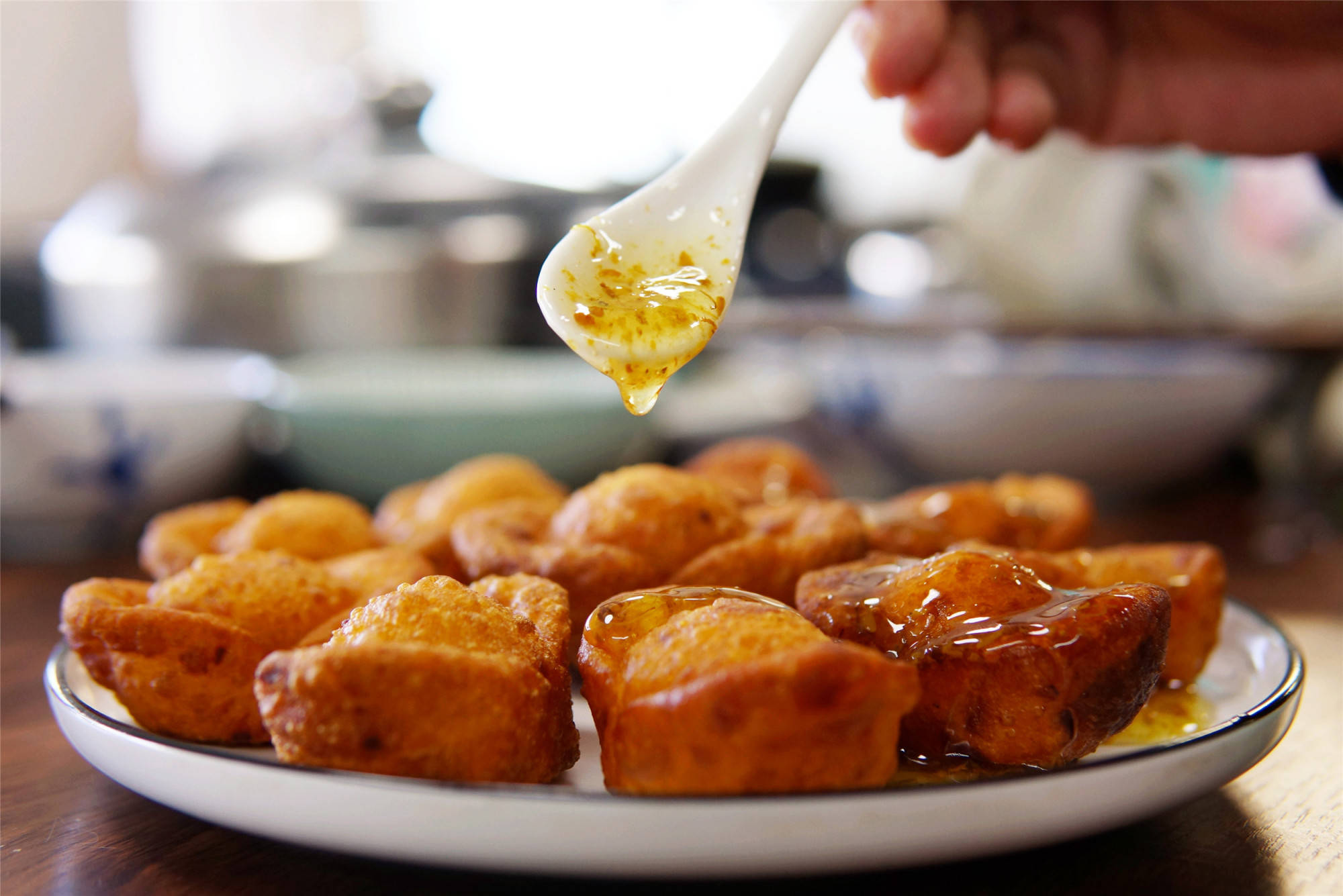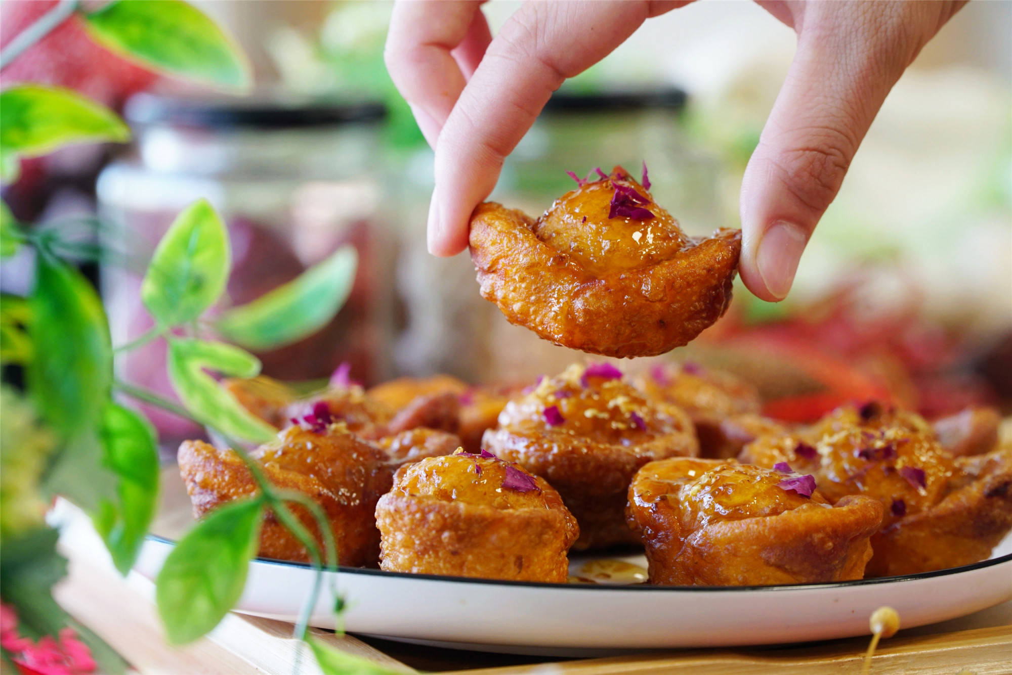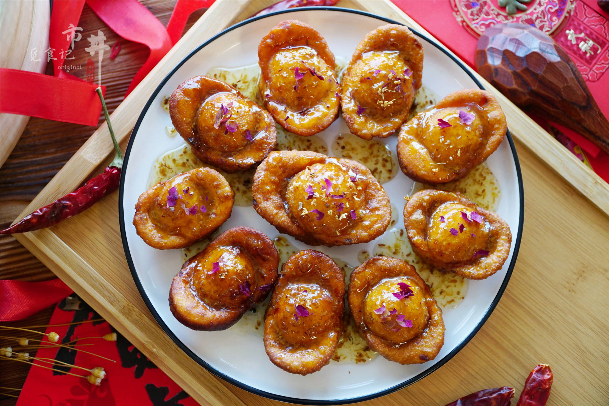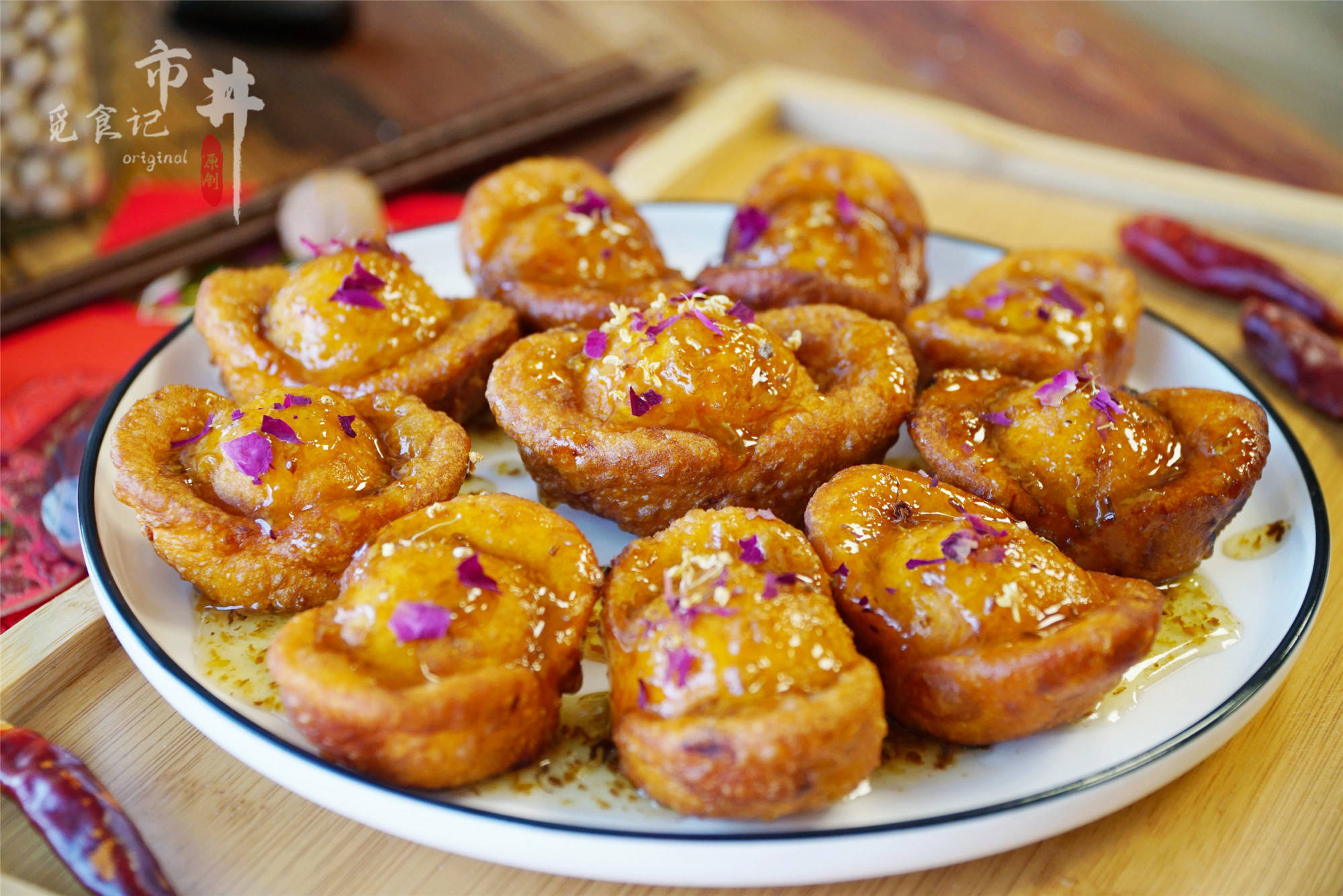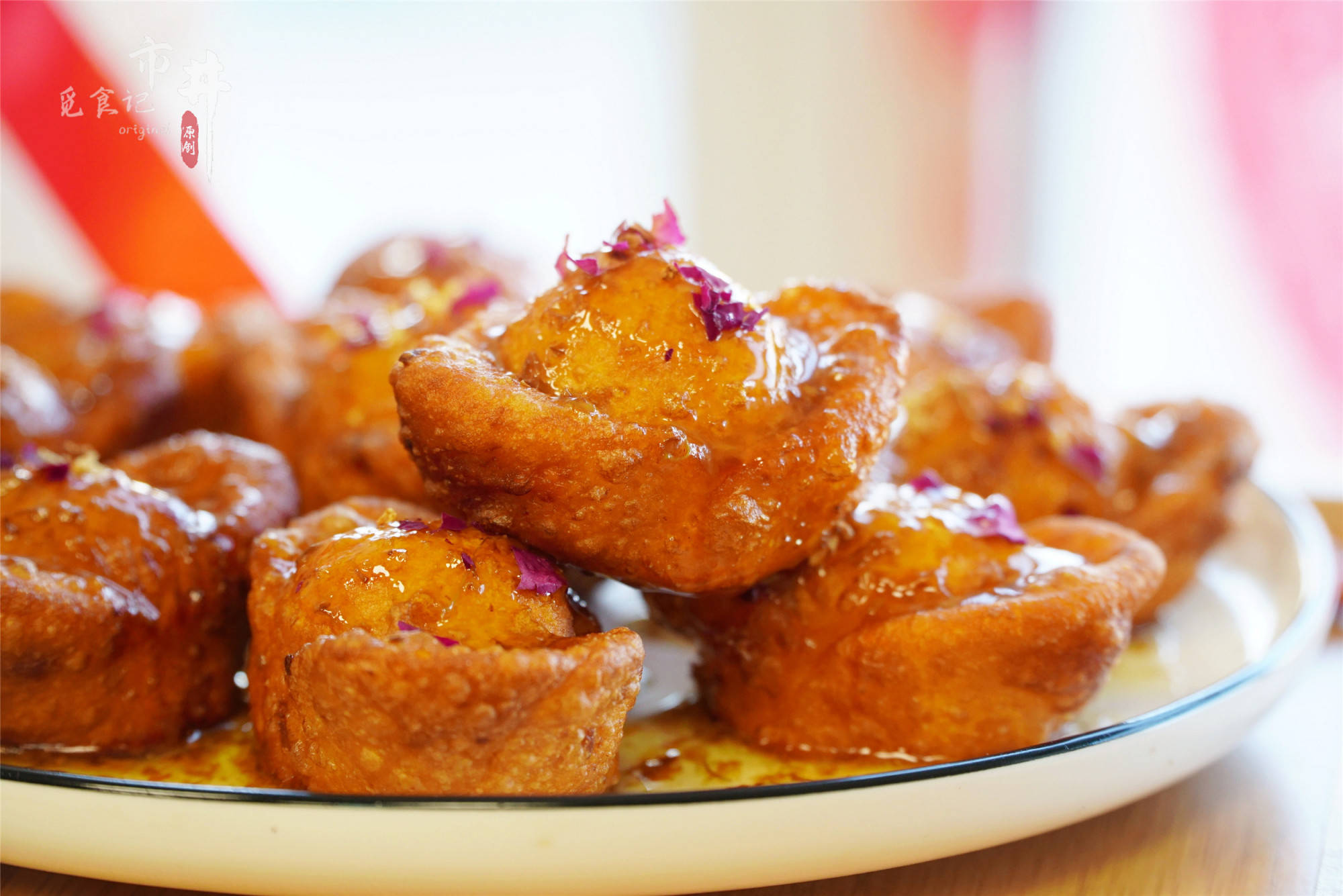 5、待炸好的元宝晾至微凉后,淋上糖桂花,撒上玫瑰花瓣装饰即可,色泽金黄、寓意富足的炸元宝就做好了。