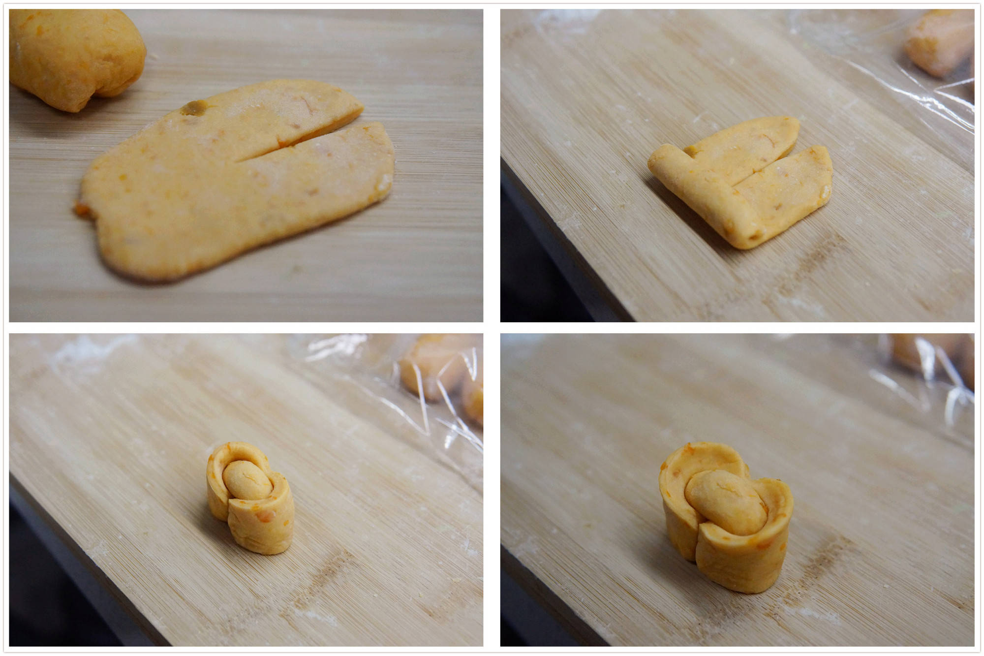 面剂子擀成椭圆形,在一边中间切一刀,从另一端卷起来后,掰开后整理一下造型即可。