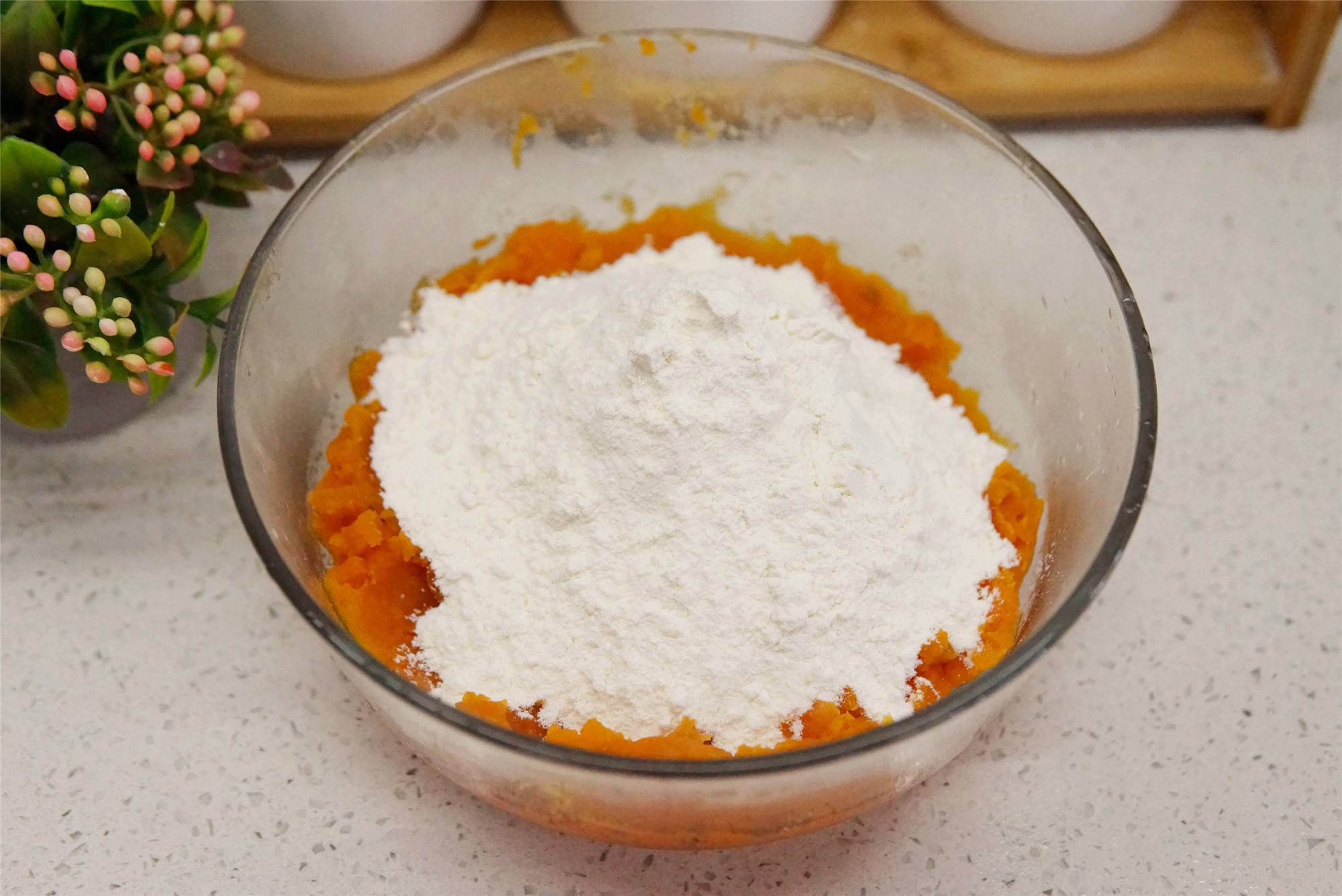 2、趁热将2勺白糖加入蒸好的红薯中,用勺子压成泥状后,少量多次地加入面粉,直至可以团成面团。