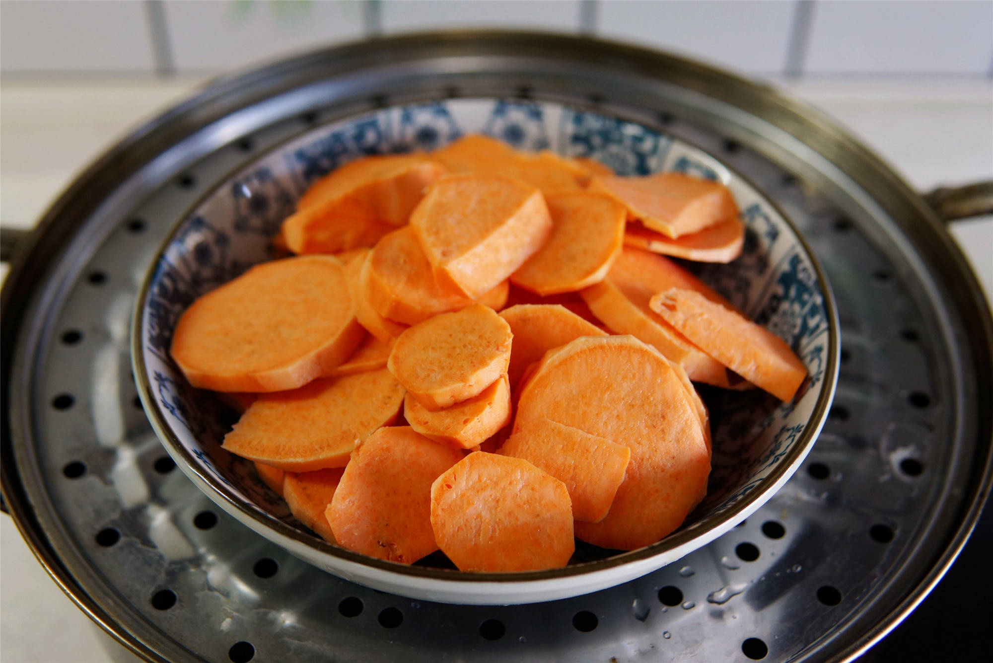 1、红薯清洗干净后削去表皮,切成薄片,放入盘子中上蒸锅蒸15分钟左右,用筷子可以扎透就说明红薯蒸熟了。