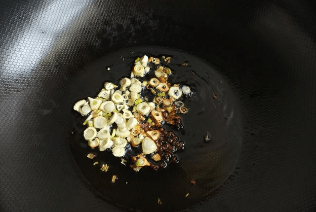 2. 炒锅烧热倒油,放入花椒和大蒜炒香。