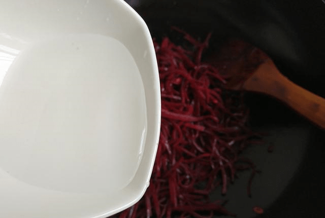 5. 当锅里的水收没,紫菜头炒得就算熟了,关火盛盘。蒜香紫菜头口感好吃,对于贫血、都晕乏力的人一定要多吃哦。