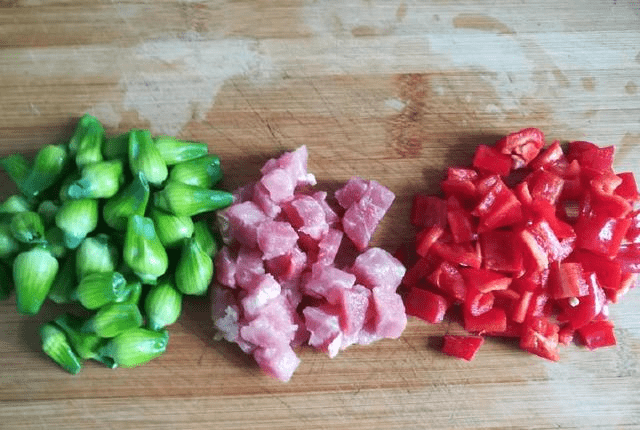 2、所有食材洗干净,猪瘦肉、蒜苔花苞、红辣椒都切成丁。