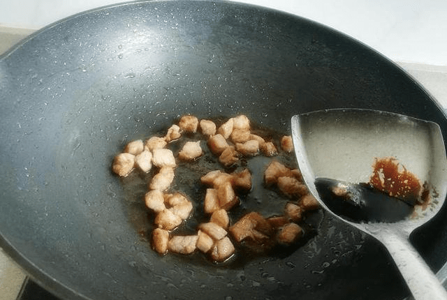 3、锅中倒入油烧七成热,加入瘦肉丁油煎一下,加入盐和生抽。