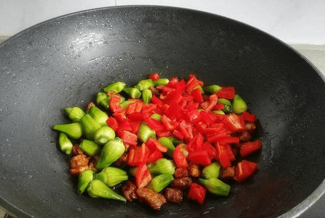 4、将猪瘦肉炒香,并且将肉炒至九成熟,加入蒜苔花苞和红辣椒丁。