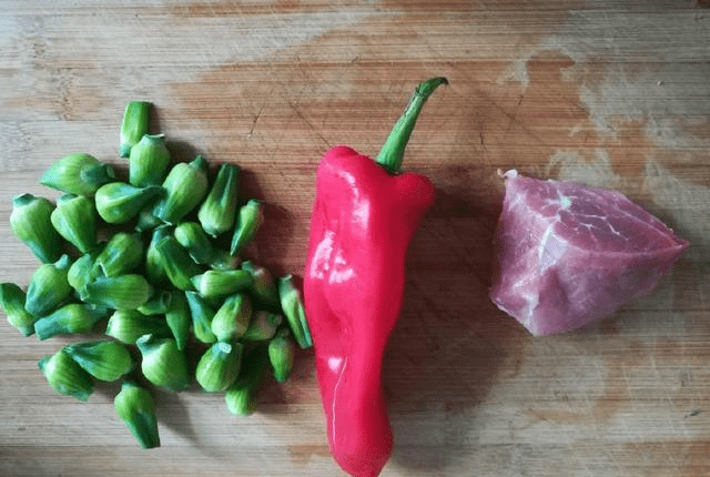 主料:蒜苔花苞100克、猪瘦肉40克、红辣椒1个。
