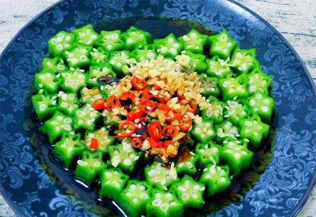 食材:秋葵、大蒜、生抽、麻油、红椒。