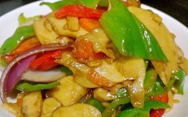 食材:杏鲍菇 胡萝卜 青椒 红椒 洋葱 蒜头 酱油 蚝油 料酒 盐 白胡椒