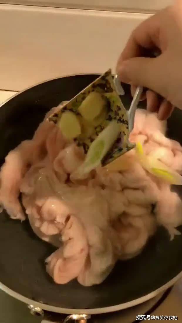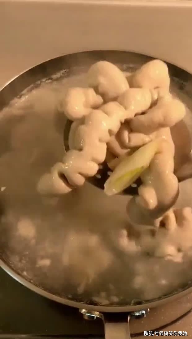 锅中放适量的清水,猪大肠冷水下锅,放入葱姜段。