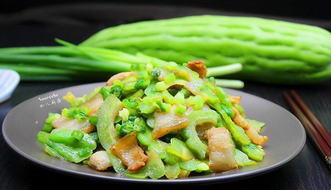 材料:苦瓜 1根、五花肉 300克、花生油 5ml、盐 5克、酱油 2ml、生姜 3克、香葱 10克