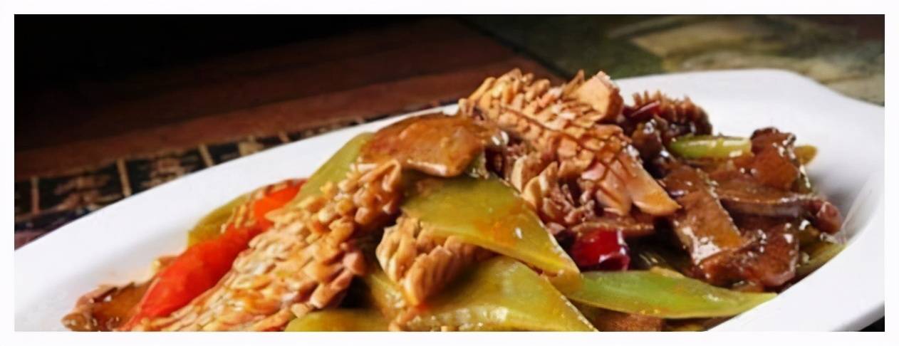 1、猪腰撕去油膜洗净,对剖后片去腰骚,横斜片切至猪腰3/1处,再按三刀一断,切成约0.6厘米,长成约6厘米的凤尾花条形,猪肝切成柳叶薄片;青笋切成薄片。