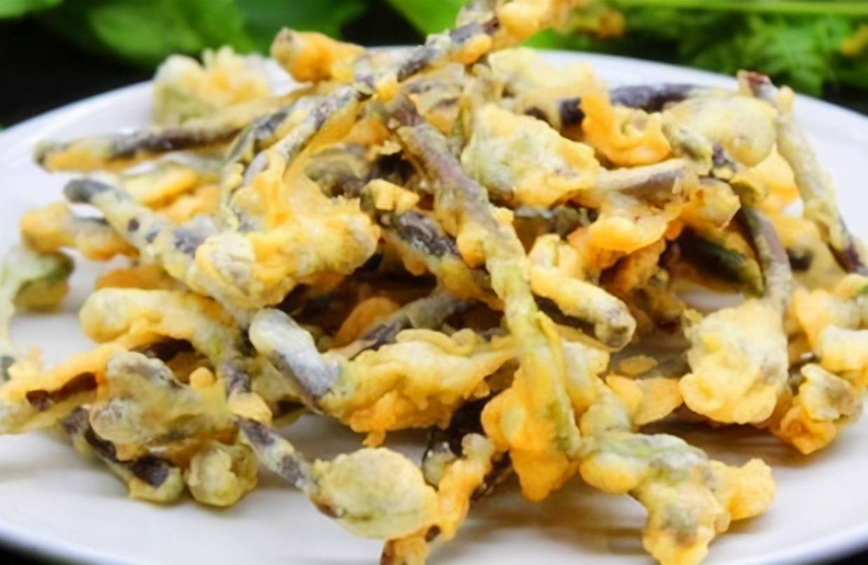 2、裹炸粉150克加适量的水、盐、五香粉拌均成面浆,放入蕨菜裹上面浆;