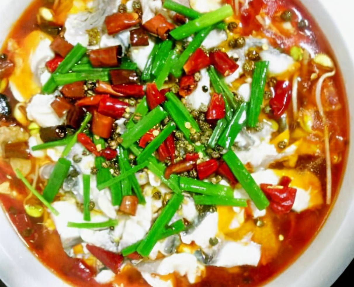 2.少许水烧开,放入鱼片烫熟,立即捞出。装品锅,水不要;将很多)油烧热后加干红辣椒和花椒若干,待油锅中辣椒颜色略微变黑的时候,将油浇在鱼片上面;