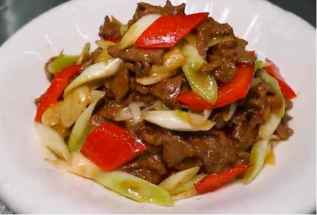 2、热锅凉油,油热7成,下牛肉片翻炒2分钟左右捞起