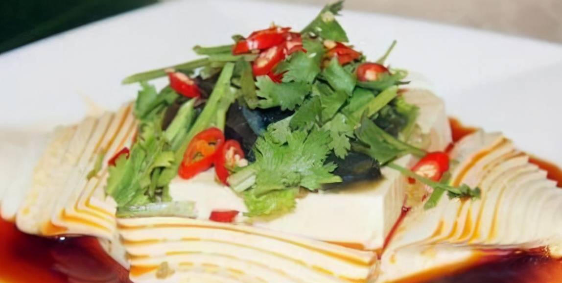 1.将豆腐放入加了盐的热水中,焯烫一下,取出后切小块码盘