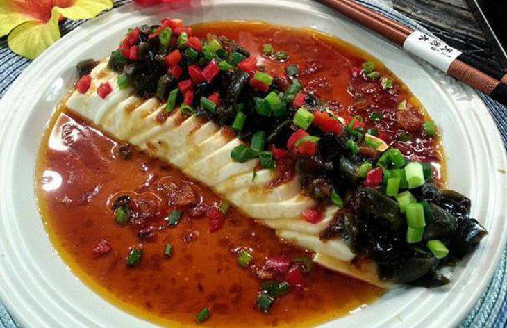 6.蒸好的豆腐撒上适量的红辣椒和葱花,然后把煮好的酱汁淋上豆腐上即可。