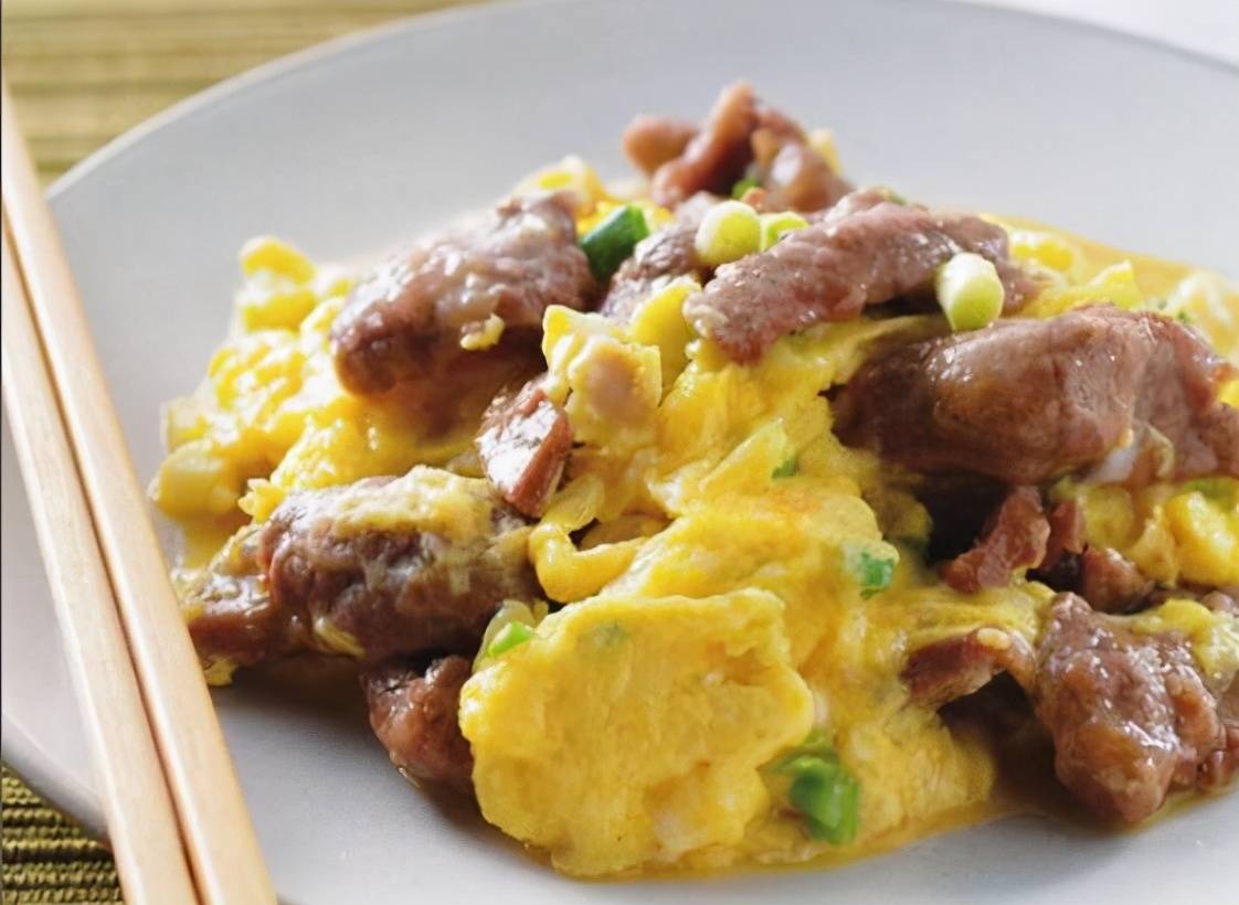 5、迅速把牛肉与蛋液混合,倒入油锅中,滑炒至牛肉凝结即可。