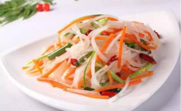 食材:白萝卜350克、胡萝卜50克、花椒3克、盐适量、醋5克、鸡粉3克、糖3克