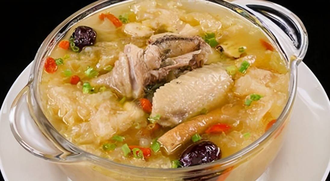 材料:鲜活银耳1盒 当归适量 黄芪适量 甘草适量 党参适量 红枣适量 枸杞适量、姜片少许 白胡椒粒少许 鸡精少许 小葱少许