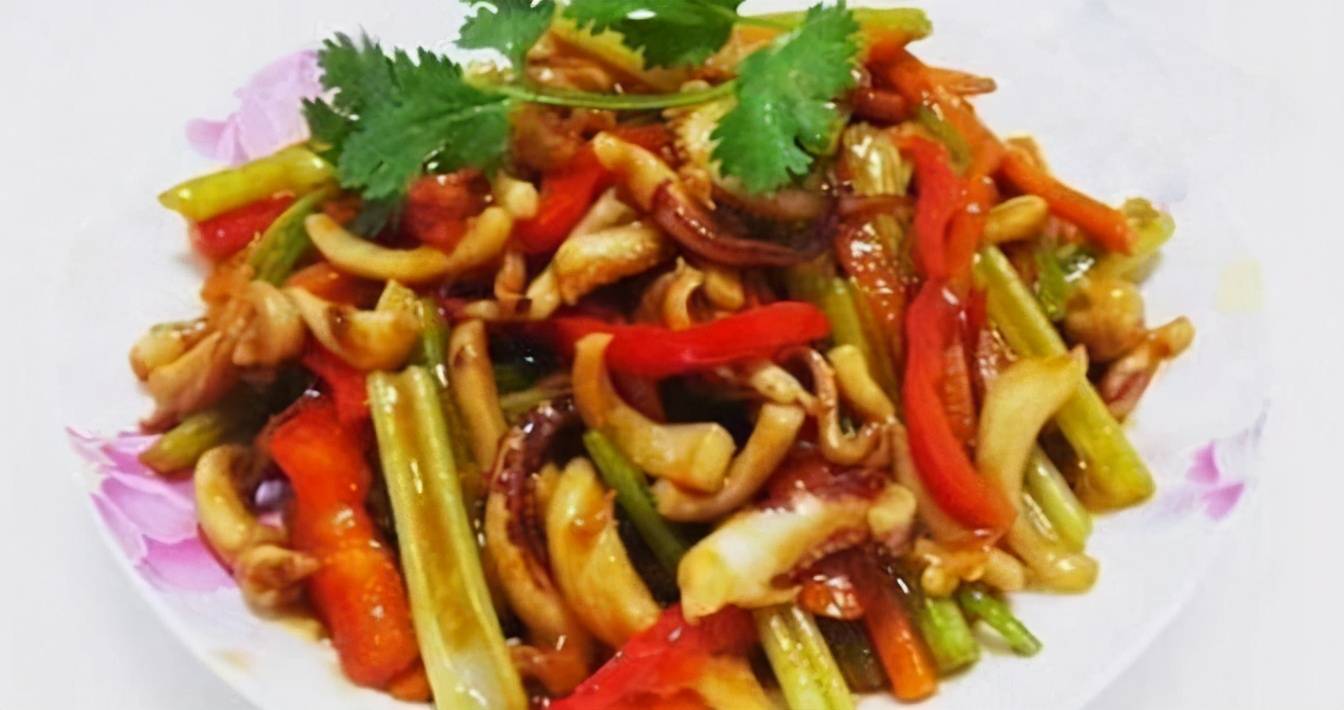 用料鲜鱿鱼2只青红椒各1个洋葱适量料酒2汤匙生姜适量切丝葱白少许生抽半茶匙盐少许