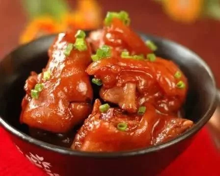 猪蹄焯水,捞出冲洗干净控干水分,豆腐乳碾碎,和腐乳汁、生抽、老抽、料酒一起混合成汁。在热油锅中放入猪蹄炒到微微发黄之后,放入3葱段姜片、八角、炒出香味,倒入兑好的汁翻炒均匀,开锅后放入冰糖和葱结,加入没过猪蹄的水,大火烧开,小火焖烧60分钟,最后大火收汁,放点鸡精就可以出锅了。